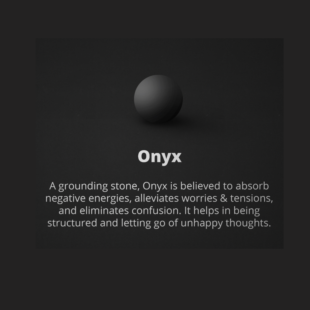 • Meaning: A grounding stone, Onyx is believed to absorb negative energies, alleviates worries & tensions, and eliminates confusion. It helps in being structured and letting go of unhappy thoughts.